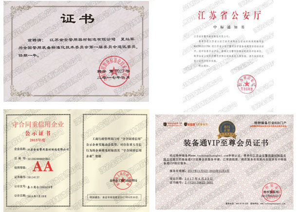 第一批新型單警裝備定點生產企業 公安部警用裝備采購中心協議供貨單位 公安部防彈防刺服生產定點企業 江蘇省公安廳防彈衣入圍企業 江蘇警用裝備行業協會會員單位 中國刑事科學技術協會團隊會員單位 中國安全防范產品行業協會會員單位 靖江市保安器材行業協會常務理事單位 全國警用裝備標準化技術委員會通訊委員 江蘇金安警用器材制造有限公司始創于九十年代初,公安部防彈防刺服生產定點企業、公安部警用裝備采購中心2..